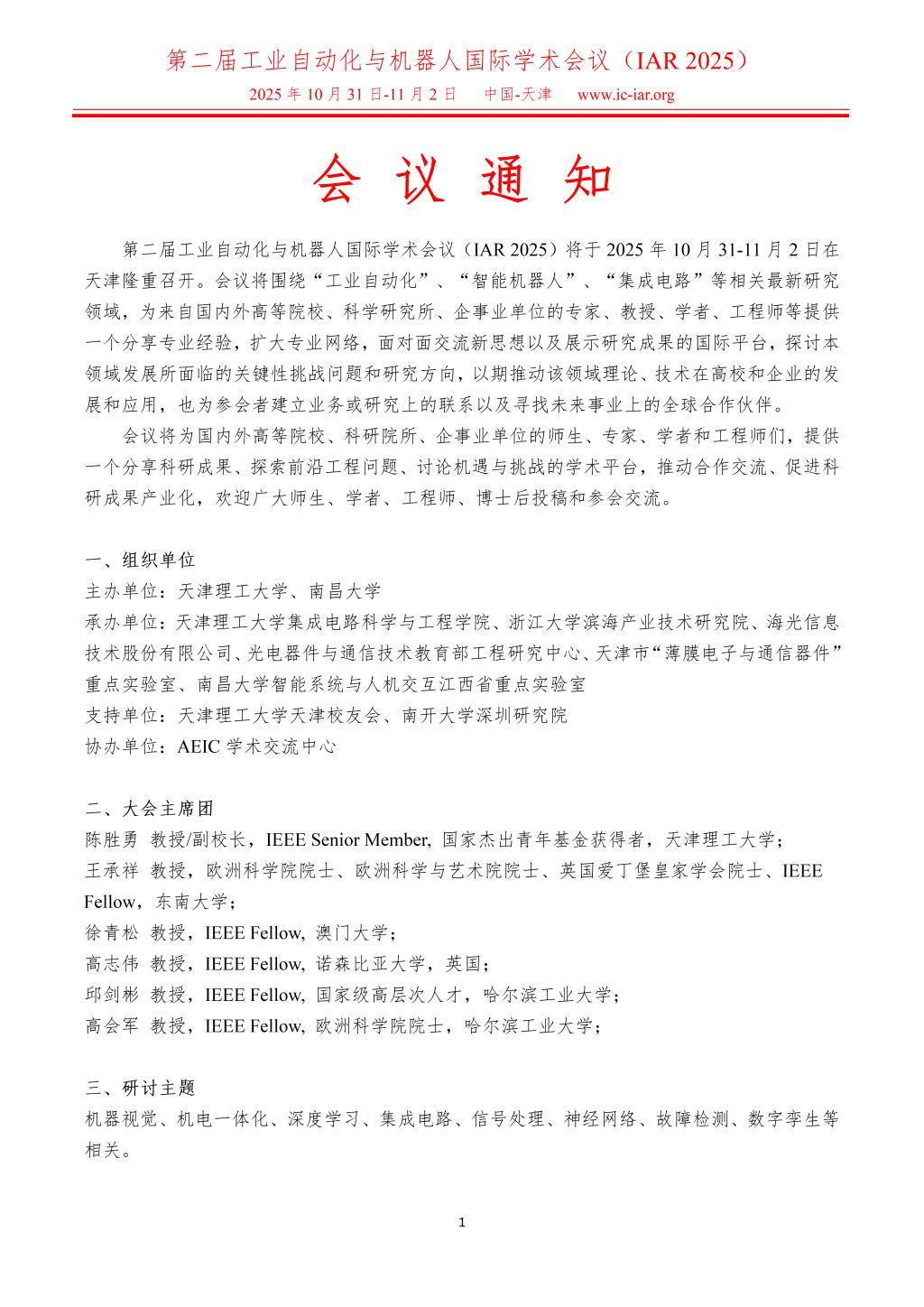 第二届工业自动化与机器人国际学术会议(IAR 2025)-会议通知